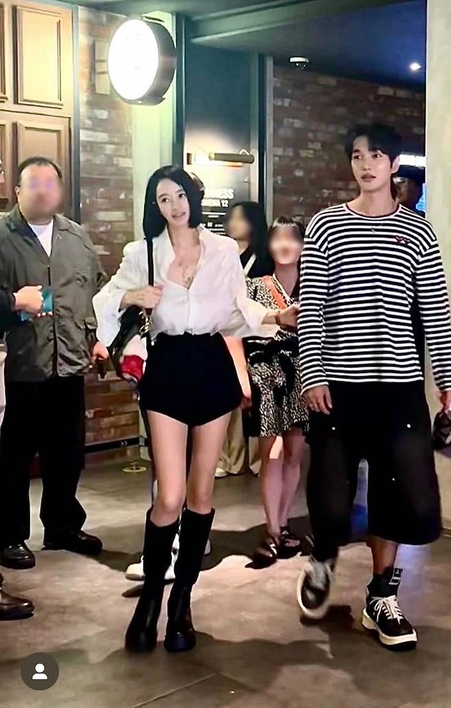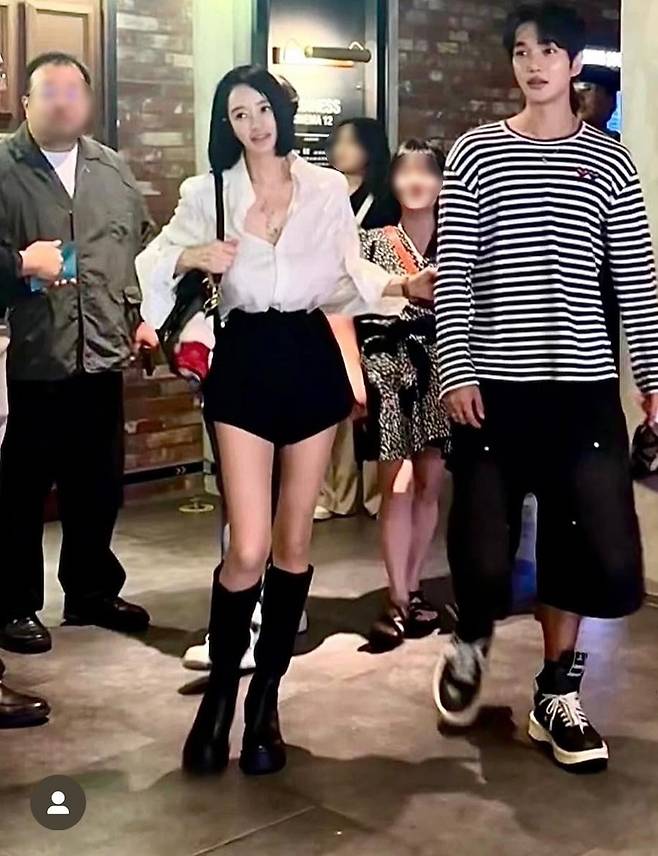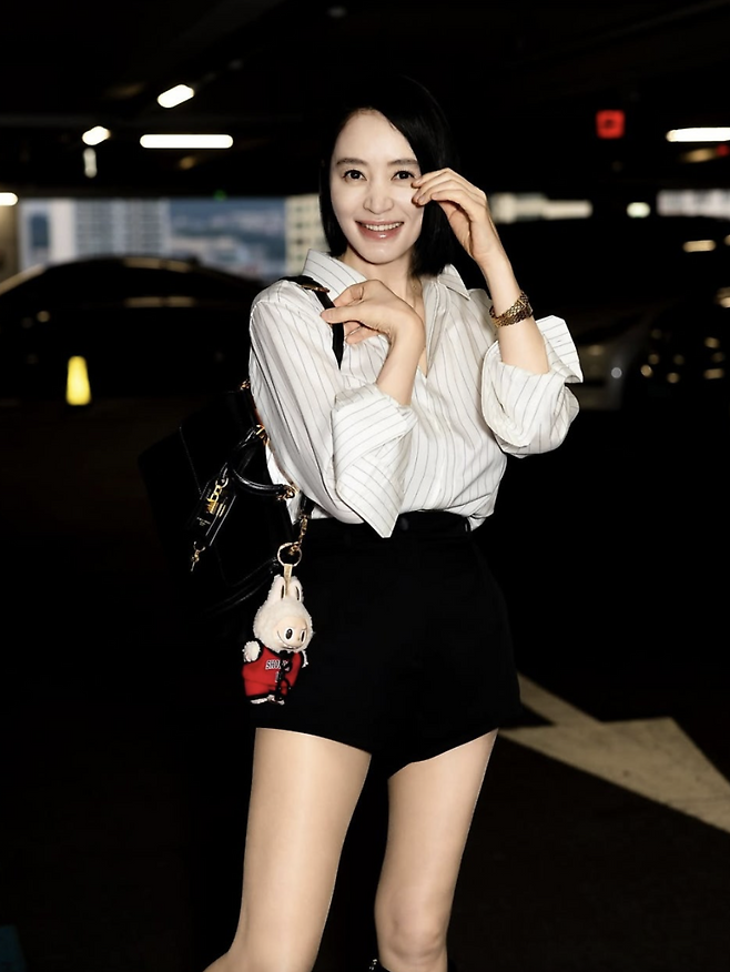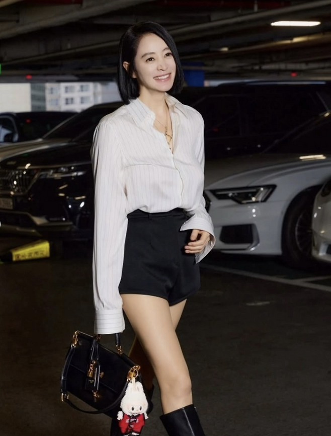 착장은 단정하지만 선명했다. 화이트 셔츠와 블랙 쇼츠 조합.