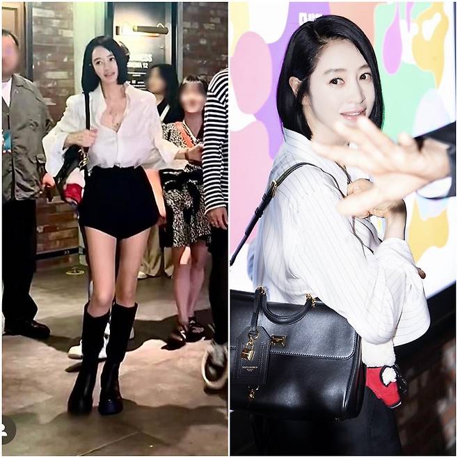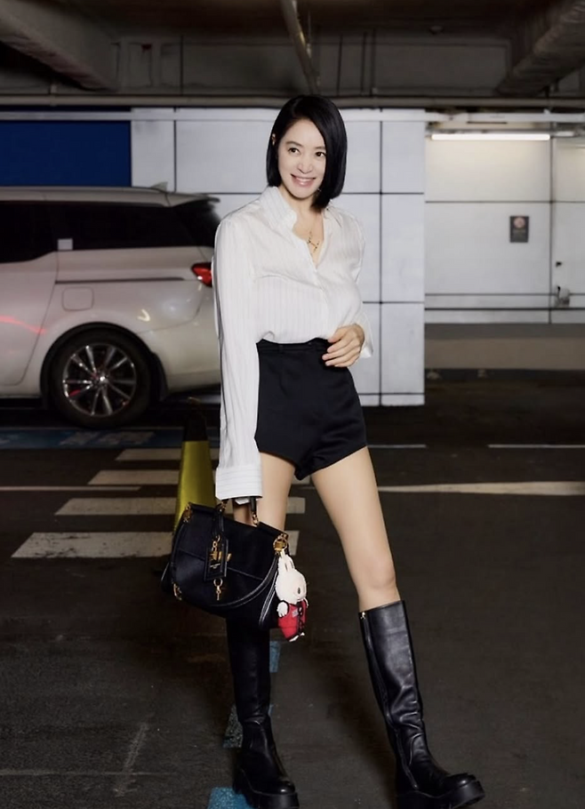 하의는 짧은 길이지만 실루엣이 정리돼 있어 시선이 산만하지 않았다. 여기에 무릎까지 오는 블랙 부츠를 더하면서 전체 비율이 안정적으로 잡혔다.