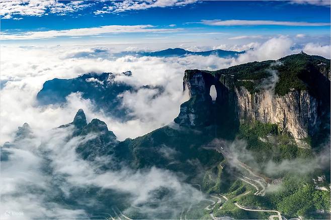 하늘로 열린 문, 천문산은 장가계 여행의 시작이자 하이라이트입니다. 세계에서 가장 긴 산악 케이블카(7.5km)를 타고 정상에 오르면, 깎아지른 듯한 절벽 위로 거대한 천문동(자연적으로 생긴 아치형 동굴)이 시선을 사로잡습니다.