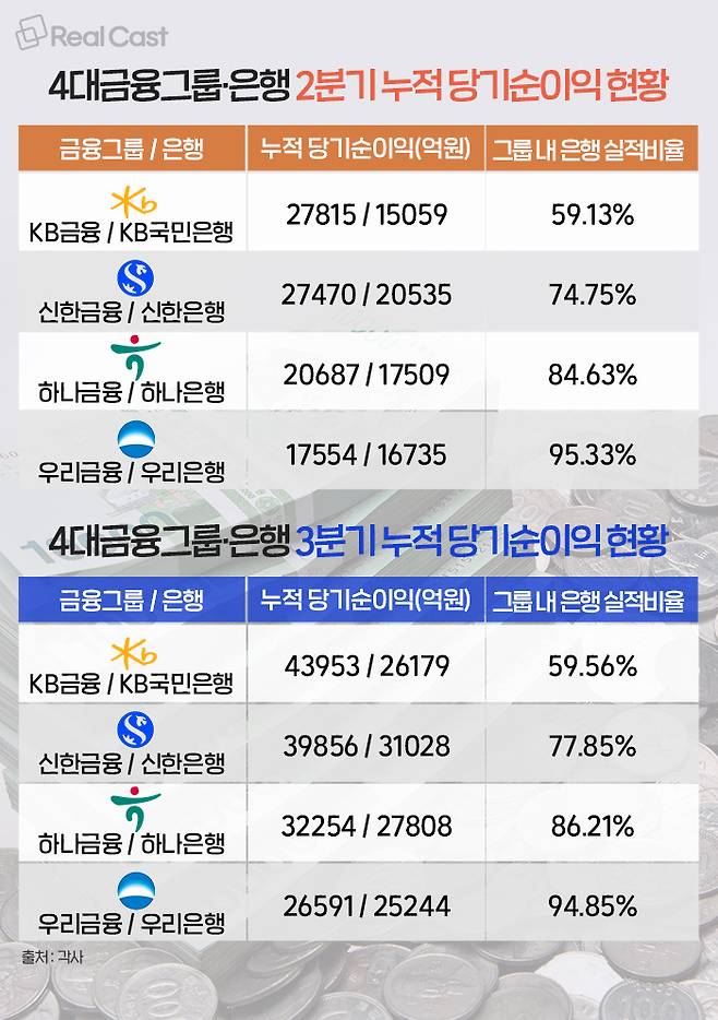 4대금융(KB금융·신한금융·하나금융·우리금융) 모두가 3분기까지 성적표를 발표한 가운데 금융그룹내 은행으로의 실적 쏠림현상은 소폭 증가한 것으로 나타났습니다.