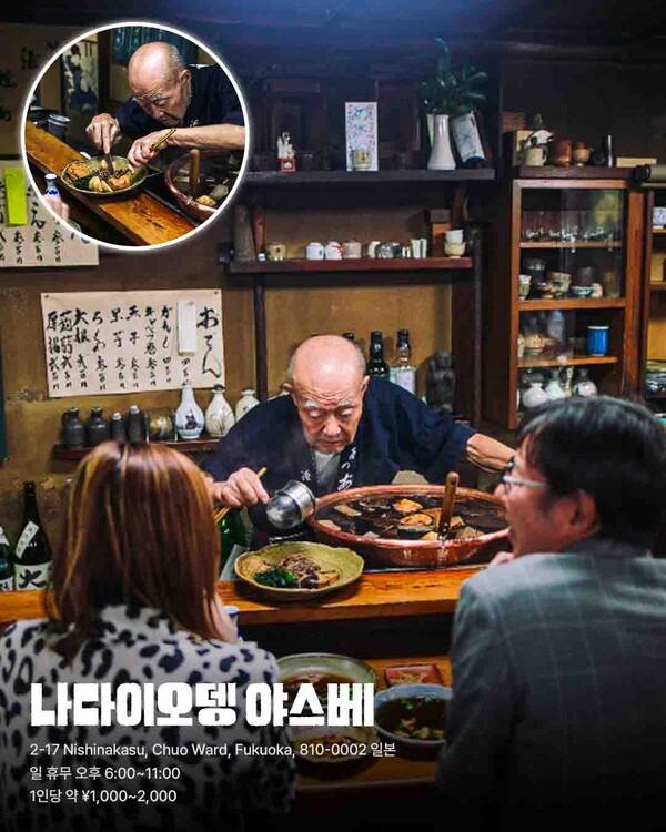 늦은 저녁, 간판도 없는 오뎅집에 들어서면 할아버지 셰프가 조용히 국물을 덜어주는 일본 현지인 추천 맛집, ‘나다이오뎅 야스베’ 입니다. 그 맛은 단순한 ‘국물 요리’를 넘어선다. 술 한 잔과 함께 오뎅을 안주 삼아 조용히 시간을 보내는 손님들.