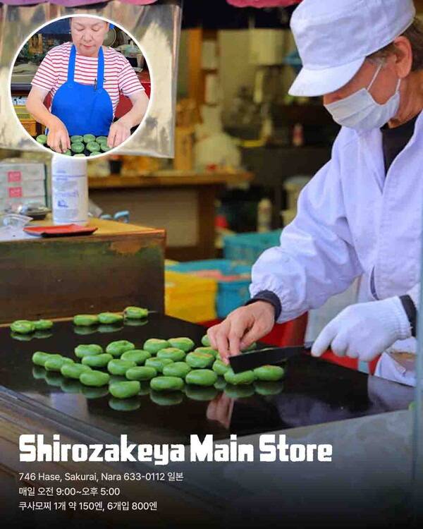 초록빛 떡이 철판 위에서 하나둘 구워지고, 장인의 손끝은 마치 공연처럼 분주한 모습을 볼 수 있는 일본 나라지역 맛집 ‘Shirozakeya Main Store’ 입니다.