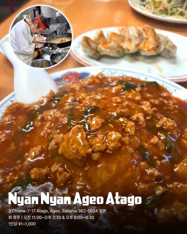 불맛 가득한 볶음면 위엔 장인의 열정이, 짜릿한 마파소스엔 수십 년 조리 경험을 담은 맛을 느낄 수 있는 일본 맛집 ‘Nyan Nyan Ageo Atago’ 입니다.