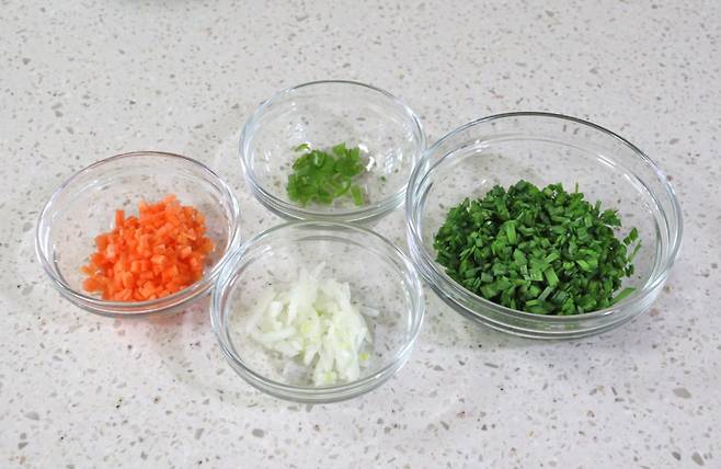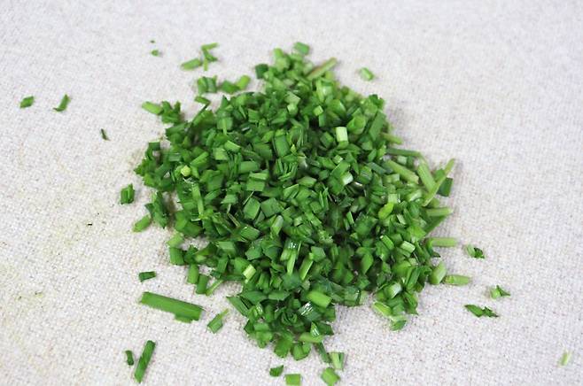 부추는 깨끗하게 씻은 후, 물기를 충분히 털어낸 다음 송송 썰어줍니다.
