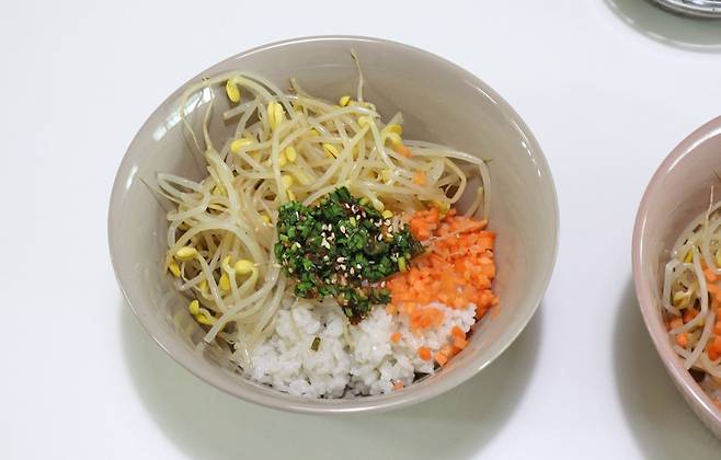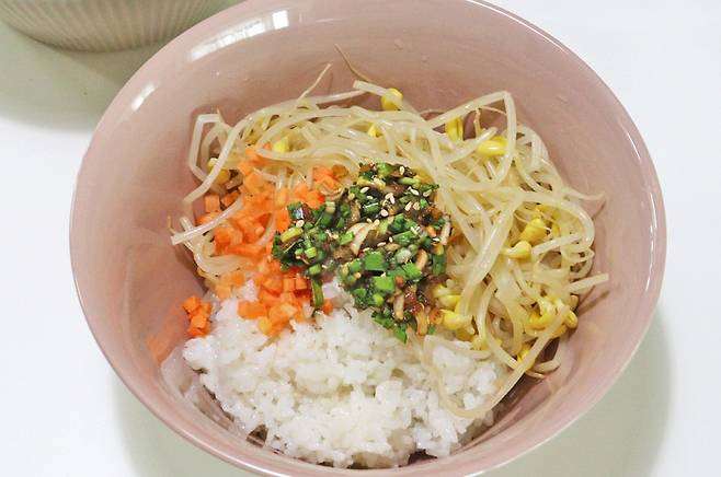 따끈한 밥에 콩나물과 색감을 더해줄 당근을 썰어 같이 넣어준 다음 부추 양념장을 넣어 쓱쓱 비벼줍니다.