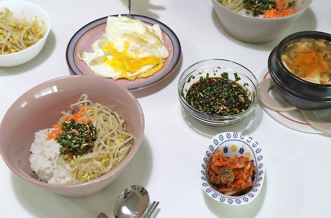 반찬 만들기 귀찮은 날, 냉장고에 아무것도 없을 때 입맛 없는 날 딱 좋은 메뉴 바로 부추양념장 콩나물밥입니다.