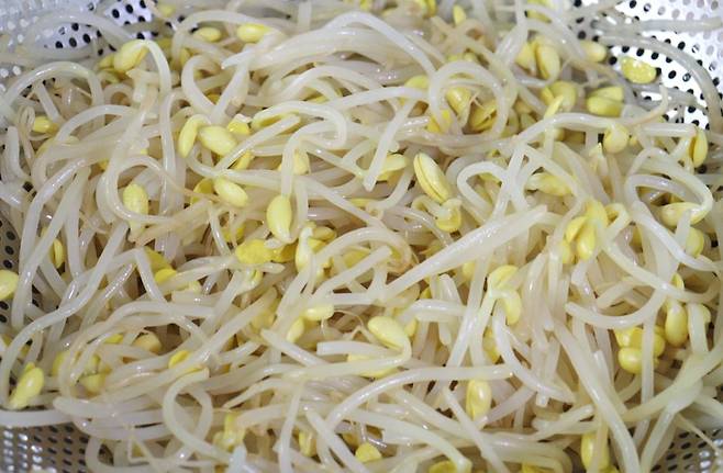 물이 끓어오르면 콩나물을 넣고 약 5분간 데쳐준 다음 콩나물을 건져내어 찬물에 충분히 식힌 뒤 물기를 꼭 짜서 준비합니다.