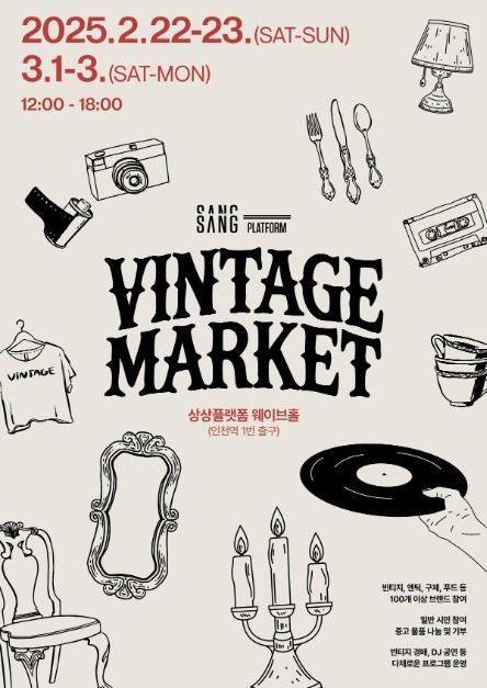 인천 상상플랫폼에서 국내 최대 규모의 빈티지 마켓이 열린다. '상플 빈티지 마켓'이라는 이름으로 2025년 2월 22일부터 23일까지 이틀간 인천 중구 상상플랫폼 웨이브홀에서 개최된다.