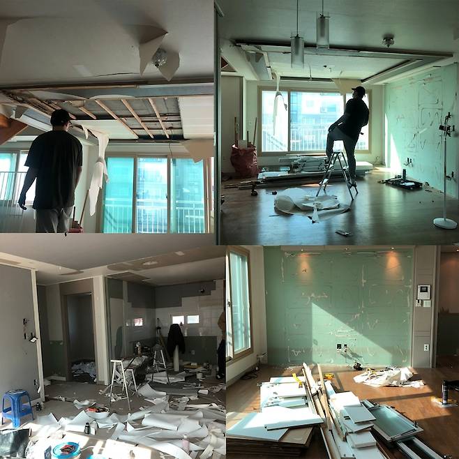 거실에 크고 끔찍한(?) 아트월이 있었는데, 보면서 살 자신이 없어서 '이것만은 내가 뜯어야겠다.' 결심했거든요. 하나씩 뜯다 보니 우물천장도 뜯고, 부엌도 다 뜯고, 결국 점점 뜯는 게 많아지면서 공사가 커졌어요. 1개월을 예상하고 시작했던 일이 계속 길어지더라고요. 원래 이런 거 맞죠?