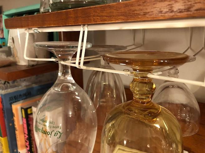 와인잔 걸이대는 이케아에서 구매했는데, 앞에 막아주는 게 없어서 옷핀을 꼽아 사용하고 있어요. 평소에 어디 놀러 가면 그곳에서 본 예쁜 와인 잔을 모으는 게 취미거든요. 인테리어 효과에도 좋아서 추천드려요!