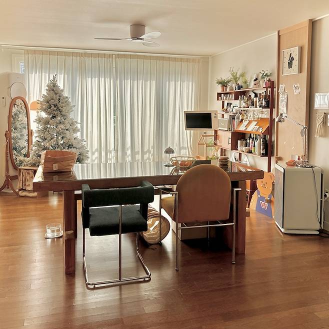 그래서 요리를 좋아하는 남편을 위해 소파를 과감하게 치우고 큰 다이닝 테이블을 두어 웃고 먹고 즐기니 훨씬 좋더라고요. 결국엔 둘이서 사는 거니까 남들이 정한 어떤 공식이나 방식에 얽매이지 않고 가족들이 모두 편하고 즐겁게 사용할 수 있는 공간으로 재구성해 보는 시도들을 많이 해보는 게 중요한 것 같아요.