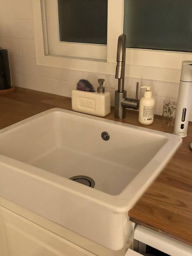 이케아에서만 할 수 있는 도자기 수전! 2년 사용해 본 소감은 절대 비추천입니다. 물 때가 잘생겨서 스트레스도 많이 받고, 얼마 전에는 도마를 놓쳤다가 수전에 금이 갔어요. 보수를 해서 사용하는 데에는 문제가 없지만 수전을 바꾸려고 알아보니 상판까지 모두 함께 바꿔야 한다고 하더라고요. 그래서 일단 보수만 해두고 계속 사용하고 있습니다.