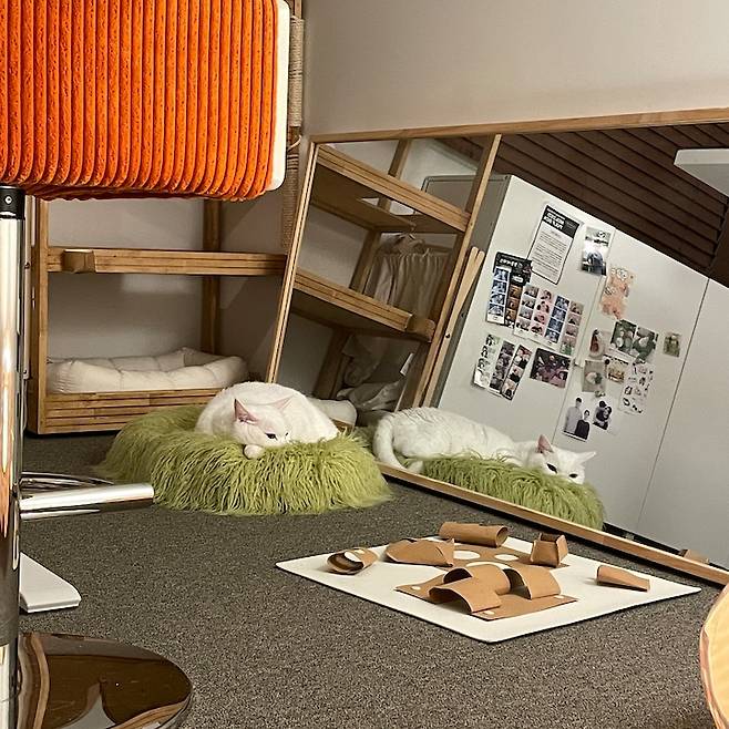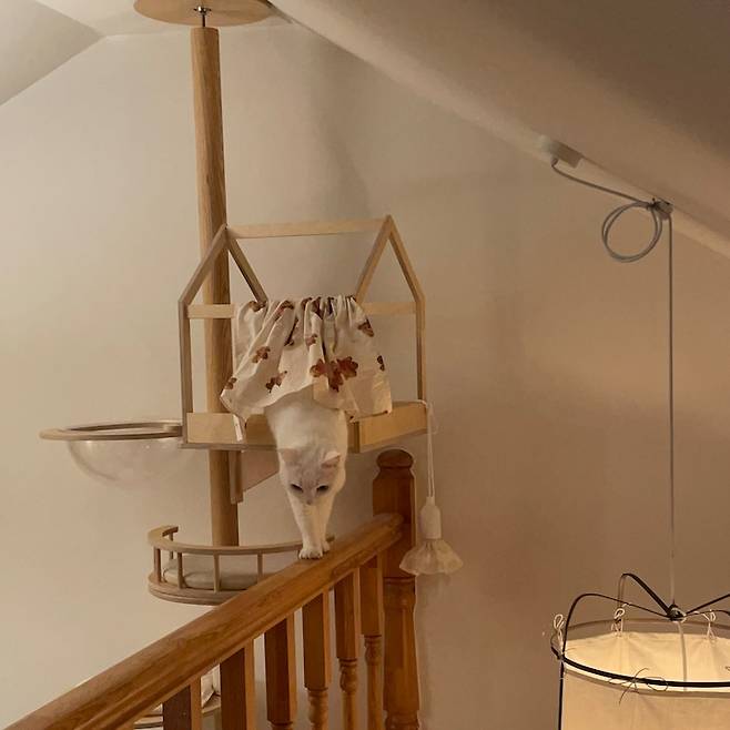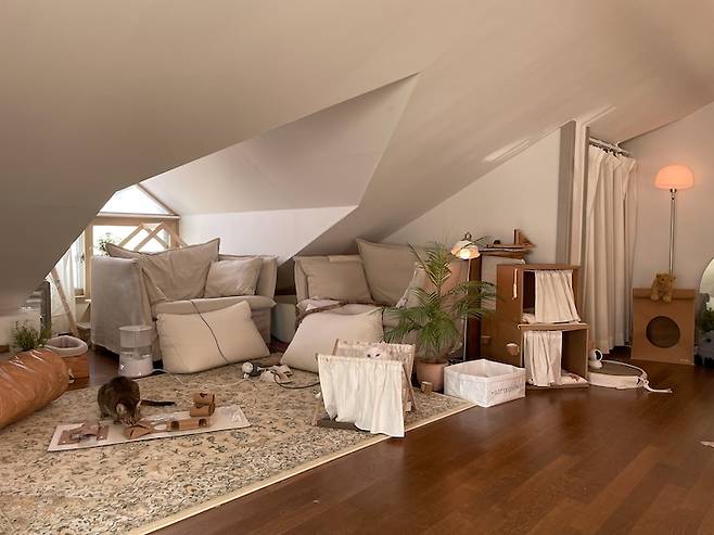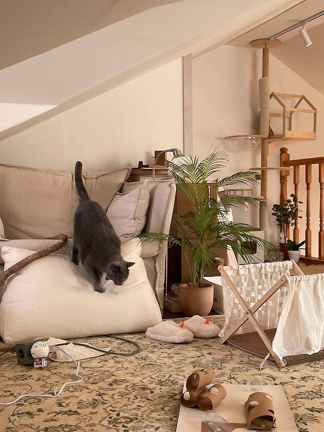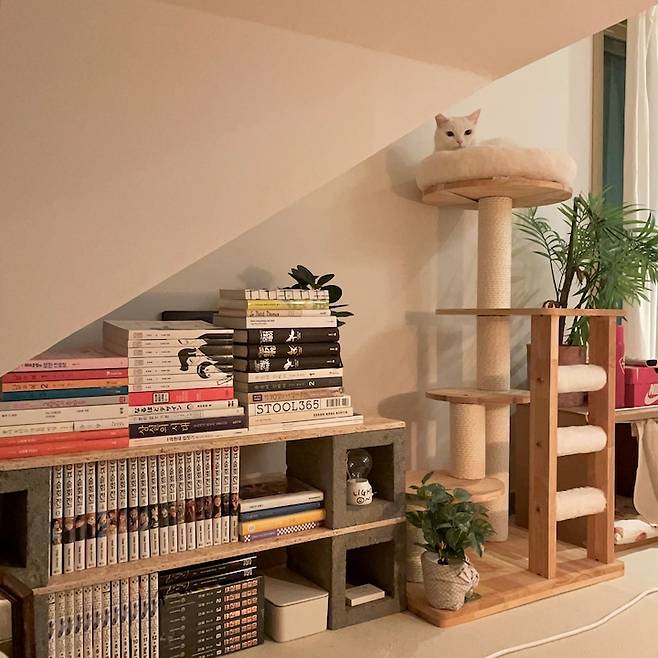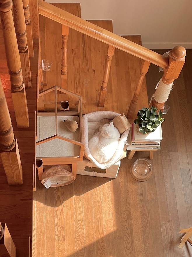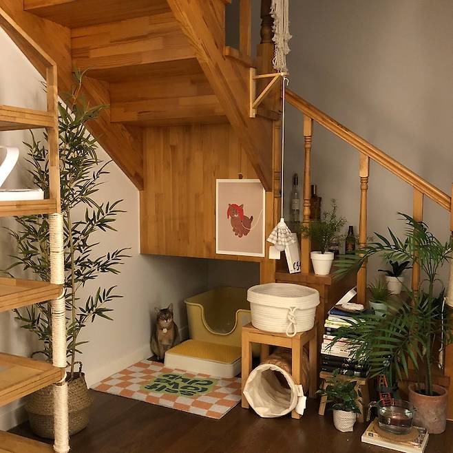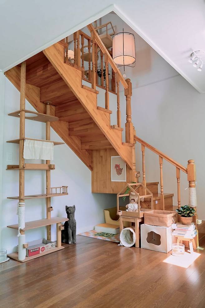 계단 근처는 고양이들 놀이터처럼 꾸며줬어요. 계단 아래로 큰 캣타워가 있고, 계단 밑 공간에는 고양이 화장실을 뒀어요. 맞춤 한 것처럼 잘 맞더라고요. 그 옆으로는 몇 가지 고양이 집을 배치했어요. 가장 아래 기둥에는 고양이가 스크래처로 사용할 수 있게 황마 끈을 감아뒀어요.