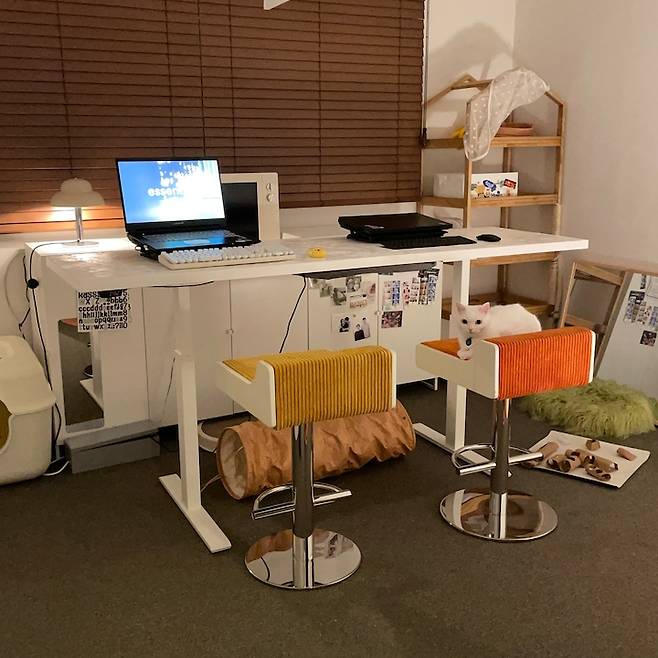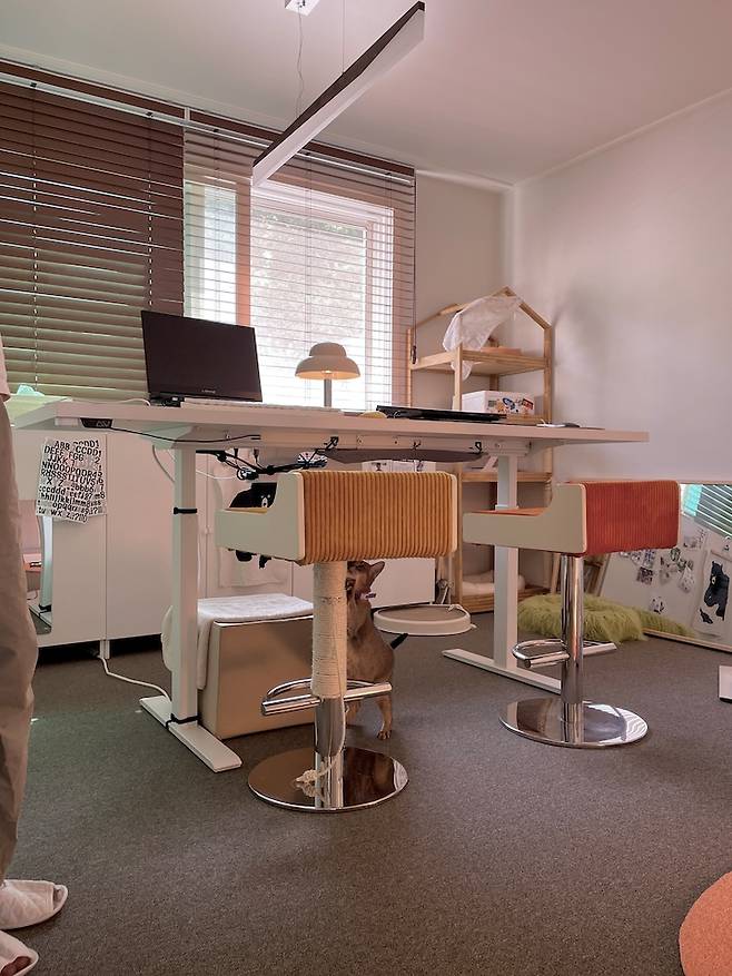 마루 시공을 하지 않아서 바닥에 카펫으로 셀프 시공을 했어요. 카펫을 사용하니 발에 느껴지는 촉감도 좋고, 다른 공간과 완전히 분리되는 느낌이라서 업무에 집중도가 높아지는 것 같아요. 테이블은 diy로 만든 건데 이케아 전동 다리만 구매해서 만들었어요. 가끔 졸리면 서서 일을 할 수 있어서 좋더라고요!