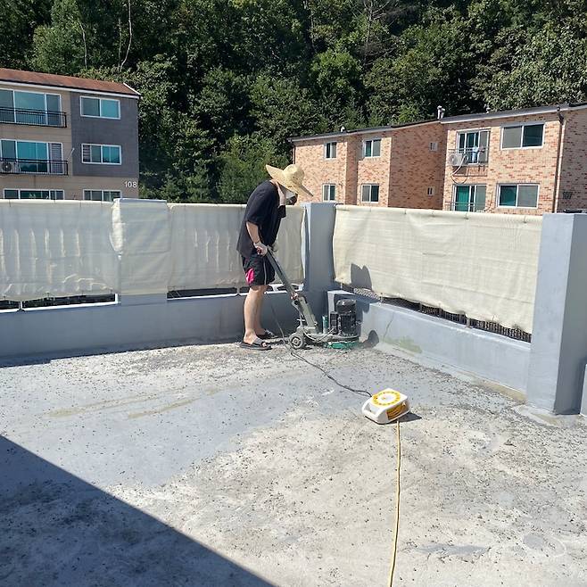 테라스는 방치 그 자체였어요. 10년 이상 방치되어 코팅도 까지고 갈라진 바닥도 보였죠. 근처 철물점에서 방수 코팅 까는 기계를 빌려 유튜브로 공부하면서 직접 방수를 했어요. 테라스가 있는 집을 가졌으니 이 정도는 알아야 되지 않을까 싶어서 그랬죠. 제가 한 셀프 인테리어 중에서 가장 힘들었던 작업이었어요.