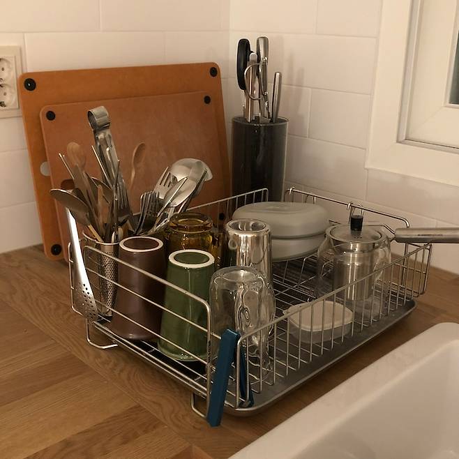 식기세척기를 주로 사용하고 있어서 식기 건조대가 클 필요가 없더라고요. 자주 쓰는 컵들과 간단한 식기류만 두는 편이에요.
