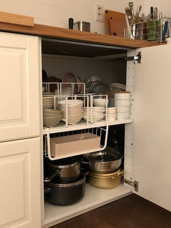 이케아 주방 코너 수납장이 유명한데, 저희는 집 구조상 설치할 수가 없어서 일반 선반형을 사용하고 있어요. 식기류는 보관하기 좋게 통일했어요.