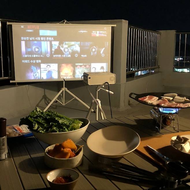 처음에는 테라스에 스크린 빔을 설치해서 밥 먹으며 넷플릭스를 보기도 했어요.