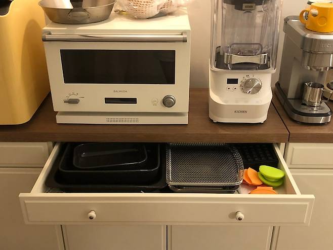 오븐 겸 전자레인지 아래 수납장에는 관련 조리도구들을 모아 두었어요.