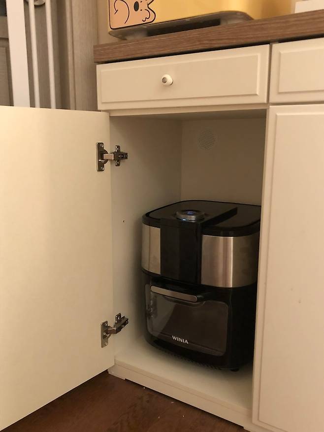 위니아에서 가전을 맞추면서 받은 포인트로 산 에어프라이어인데, 성능은 좋지만 투박하고 덩치가 커서 수납장 한 칸에 보관하고 있어요. 사용 시에 앞으로 살짝 꺼내주기만 하면 열 빠지는 데에도 문제없이 안전하게 사용할 수 있어요.