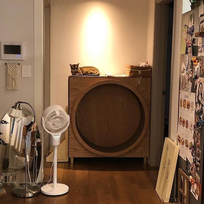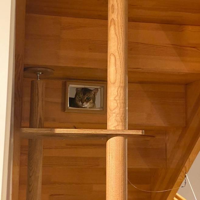 캣타워에서 이어지는 구멍이 있으면 좋을 것 같아서, 남편과 제가 직접 꼬리 톱으로 잘라 만든 고양이 구멍이에요. 이렇게 구멍을 뚫어 놓으면 나중에 집 팔 때 어떡하냐고 묻기도 하시는데, 그럼 고양이를 반려하는 가족에게 팔면 되지 않을까요? 저는 너무 만족해요!
