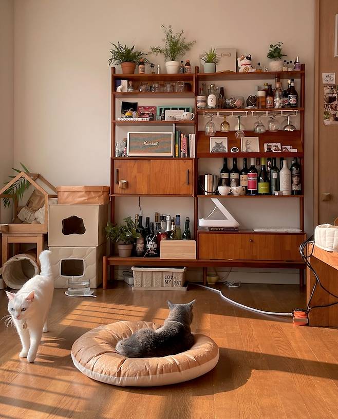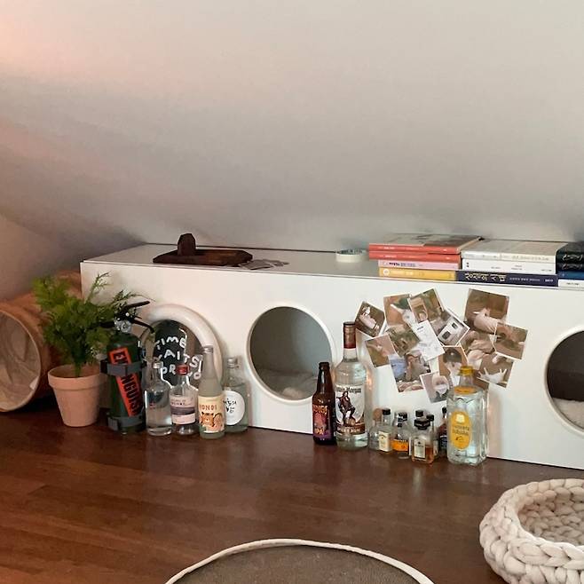 월 캐비닛 1층에는 먹지 않은 무거운 와인을 두고, 그 옆에는 고양이가 밥을 먹을 수 있는 급식소로 사용하고 있어요. 위층에 있는 와인병들은 다 먹고 비교적 가벼운 것들만 올려두고 있어요.