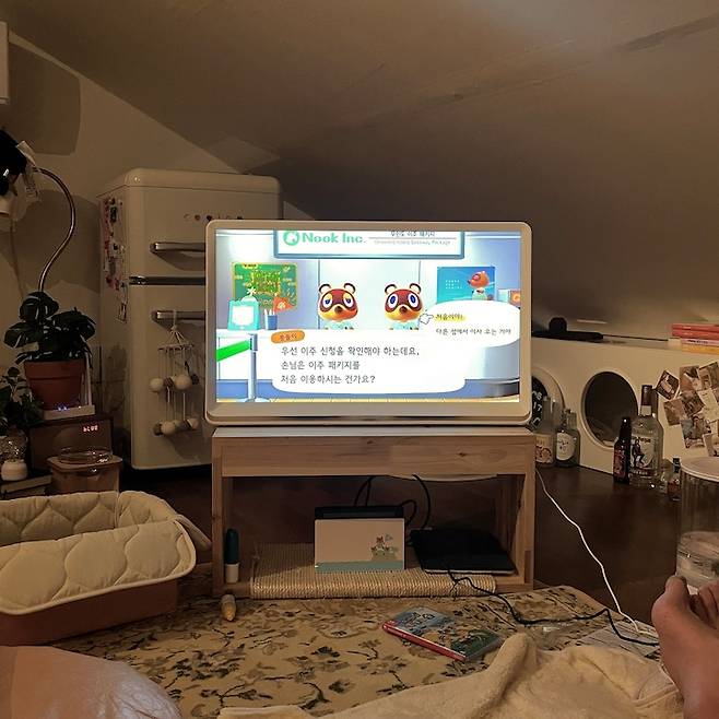 집에 TV가 따로 없어서 움직이며 사용할 수 있는 모니터를 사용하고 있어요. 돌아다니면서 사용할 수 있어서 굉장히 만족하고 있어요. 저희는 넷플릭스나 유튜브를 보거나, 플스나 닌텐도를 하는 용도로 사용하고 있어요. 뒤쪽에는 2층에서 사용하는 작은 냉장고가 있어요. 보통 음료를 많이 넣어두어요.