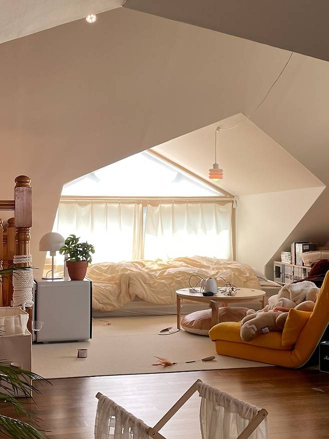 그리고 2층은 하나의 큰 공간으로 되어있어서 저희가 임의로 침실과 거실로 나눠서 사용하고 있어요. 이 집에서 가장 신기했던 부분은 일반적인 집과는 다르게 창고가 있다는 거예요. 그래서 계절 가전과 생필품을 보관하는 용도로 사용하고 있어요.