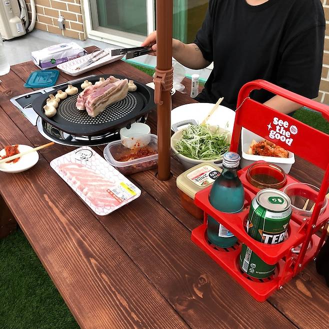 테라스에서 고기를 구워 먹을 수 있으니 따로 고깃집을 가기보다는 편하게 집에서 먹는 게 좋아요. 비용도 아낄 수 있고, 질 좋은 고기를 마음껏 구워 먹을 수 있어요.