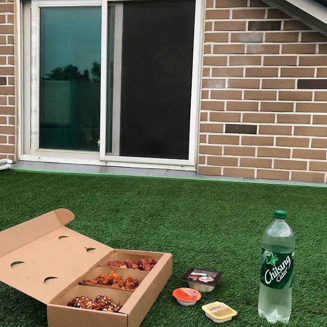 인조 잔디를 셀프로 시공 한 날 바닥에 앉아 치킨 피크닉을 했어요.