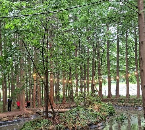카페 앞 정원에는 큰 규모는 아니지만 높고 빽빽한 메타세쿼이아 숲이 조성되어 있는데요. 나무 사이 작은 연못과 작은 다리, 동화같은 알전구가 설치되어 동화 속 요정의 숲 속에 들어온 듯한 풍경을 완성해냅니다.