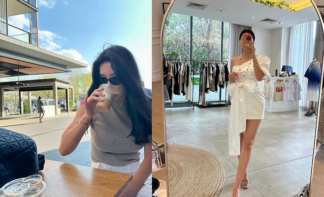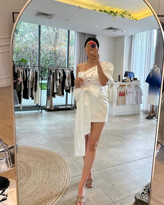 화이트 원숄더 드레스로 우아함과 섹시함을 동시에 연출하고 있다. 비대칭 네크라인과 허리 리본 디테일이 여성스러운 실루엣을 강조하며, 누드톤 샌들로 전체적인 조화를 이뤘다.