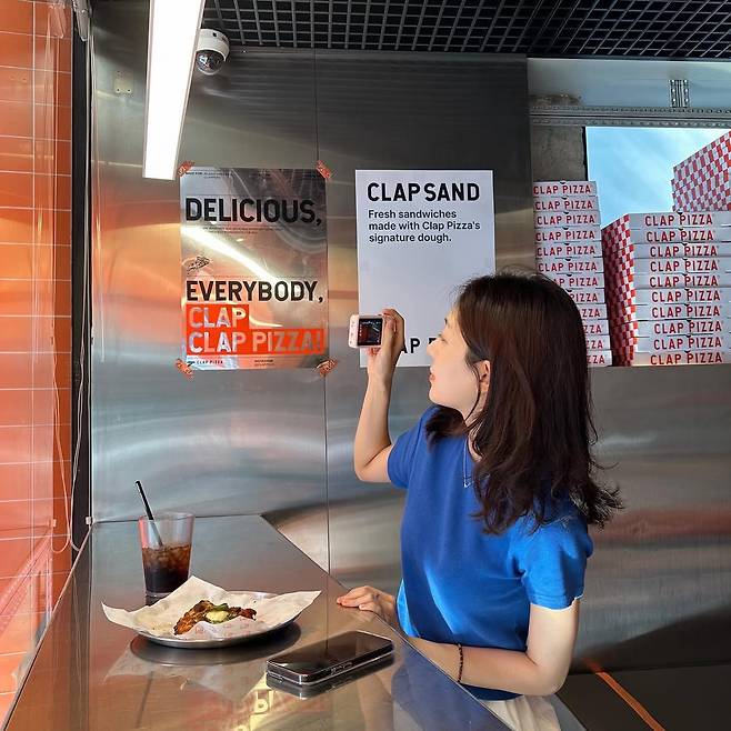 그녀는 먼저 시선을 사로잡는 선명한 코발트블루 컬러의 반소매 니트로 스타일에 포인트를 주었다.