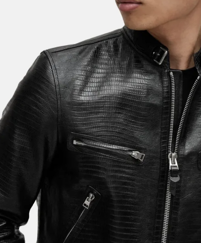 이 재킷은 송아지 가죽에 도마뱀 무늬로 엠보싱 처리되어 있으며, 고급스러움과 세련미를 동시에 갖추고 있습니다.