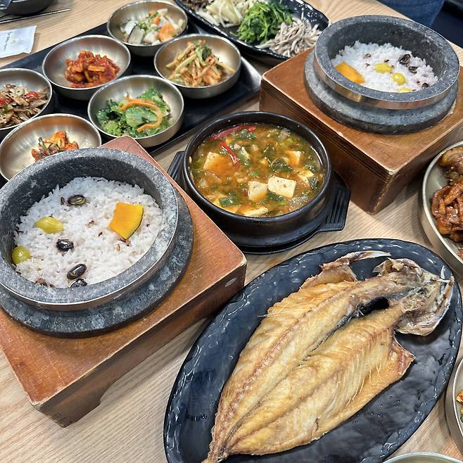 대표 메뉴는 돌솥밥 정식. 뚜껑을 열면 밥이 몽글몽글 피어오르고, 뜨거운 돌솥의 잔열로 밥알이 서서히 누룽지가 되기 시작하죠. 반찬 하나하나도 대충 만든 느낌이 전혀 없어요. 멸치볶음, 나물무침, 제철 생선구이까지 간이 절묘하고 정갈합니다.