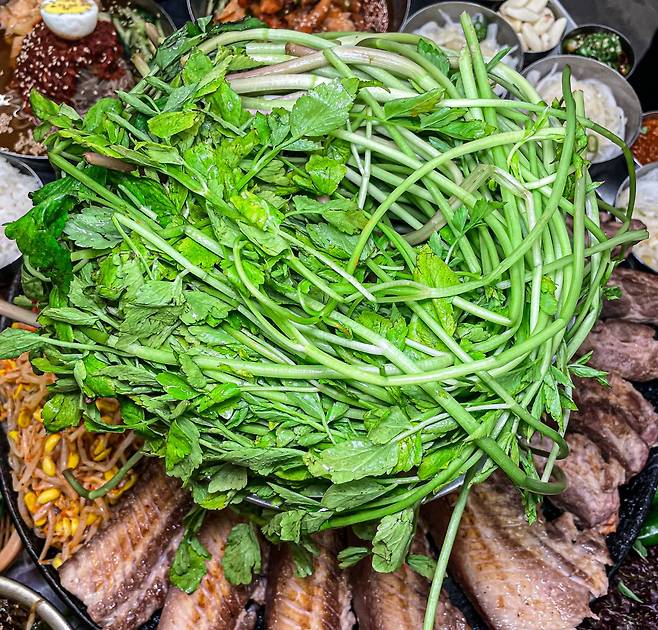 가장 인상 깊었던 건, ‘미박 삼겹살’이라는 독특한 고기. 껍질을 벗기지 않고 구워내기 때문에 겉은 바삭하고 속은 촉촉해요. 여기에 청도 미나리, 갓김치, 멜젓, 파절이 같은 반찬이 줄줄이 등장하는데, 조합하는 재미도 쏠쏠하죠. 음식뿐만 아니라 사장님과 직원들이 매달 고기 굽기 테스트를 받는다는 사실도 인상 깊었어요. 하나의 식당이 아니라 작은 고기 미식 교육장이랄까요?