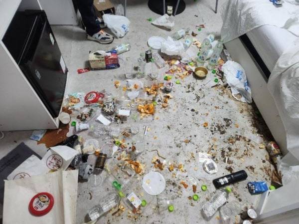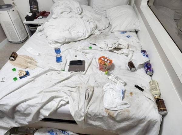 사진을 보면 모텔 방 내부가 그야말로 쓰레기장 수준으로 어지러져 있다. 흰색 장판으로 마감한 바닥은 정체불명의 검은 가루들로 뒤덮여 거무튀튀해진 상태다. 방 안은 술병, 귤껍질, 페트병 비닐봉지 등이 온통 널부러져 있다. 흰색 시트를 깔아둔 침대도 신발을 신고 올라갔는지 얼룩덜룩 더럽혀져 있고, 알 수 없는 액체가 흘러 말라비틀어진 자국이 남았다. 흰색 벽지를 발라둔 벽과 화장실 타일에도 무슨 짓을 벌였는지 얼룩투성이다.
