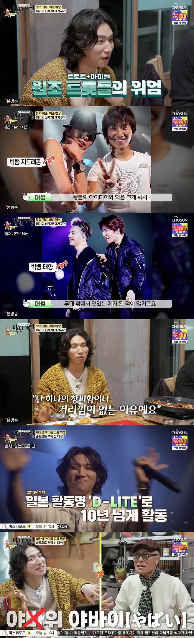 대성은 "부모님이 트로트를 워낙 좋아하셔서 나도 자연스럽게 받아들인 것 같다"며 "이런 이야기는 사실 처음하는데 빅뱅 활동을 하며 형들 아이디어와 덕을 봐서 무대 위에서 멋있는 내가 된 적이 많다. 빅뱅으로 자리를 잡고 좀더 재미있는 음악을 하는 것에 대해 하나도 창피함이나 거리낌이 없는 이유"라고 말했다.