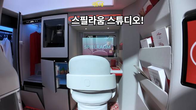 스필라움 내부에는 책상 공간과 거울 기능의 모니터, 다양한 형태의 콘센트와 USB 포트가 마련됐다. 실용성을 높이기 위해 커피 머신과 냉장고 같은 편의 시설도 갖췄다.