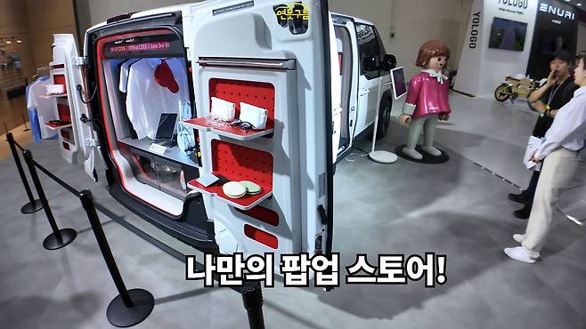 스튜디오 콘셉트의 후면부 공간 활용성도 주목할 만하다. 팝업 스토어 기능과 함께 레일을 통해 확장되는 옷걸이, 폴딩 가능한 선반들이 마련되어 있으며, 옷걸이 공간에는 조명이 삽입되어 있다. 하단 라이팅 기능도 함께 적용되어 외부에서 자신의 물건을 판매하는 이동식 판매대로도 충분히 활용될 수 있다.