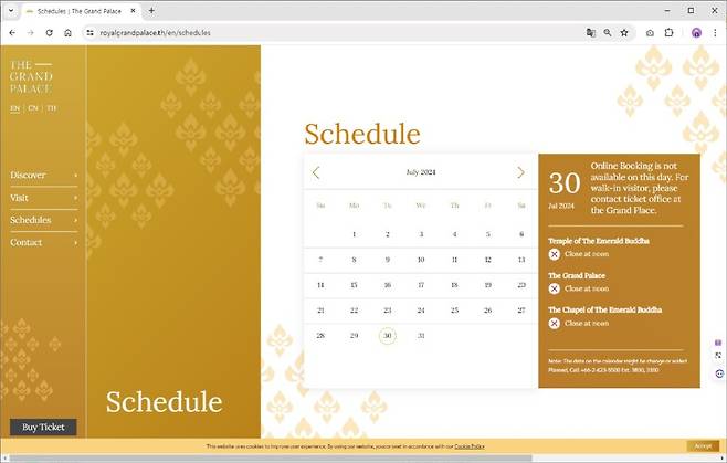 태국 왕궁을 방문한다면 미리 왕궁 일정을 확인하세요. 왕궁 행사일에는 개방하지 않거나 오전에만 방문객 입장이 허용되기도 합니다. 방콕 왕궁(그랜드팔래스)의 공식 홈페이지(https://www.royalgrandpalace.th/en/schedules)에서 왕궁 일정을 확인할 수 있습니다. 7/30일 일정을 확인해 보면 정오에 문을 닫는다는 것을 확인해 볼 수 있습니다.또한, 왕궁 근처에서 왕궁이 행사일이라 입장할 수 없다고 말하고 투어 프로그램을 이용하라고 유도하는 경우가 있습니다. 비싼 투어에 사기당하지 않으시려면 무시하고 왕궁 매표소로 가시면 됩니다.
