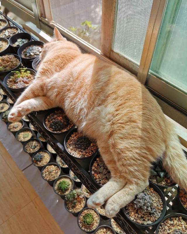 하지만 시간이 지나면서 오렌지 고양이는 발로 눌러주는 것만으로는 효율이 낮다는 것을 깨달았습니다. 그래서 연구 끝에 더 빠른 방법을 찾았으니, 바로 다육이 위에 누워버리는 것이었습니다. 누우면 면적이 훨씬 넓어져 한 번에 여러 화분을 눌러줄 수 있습니다.