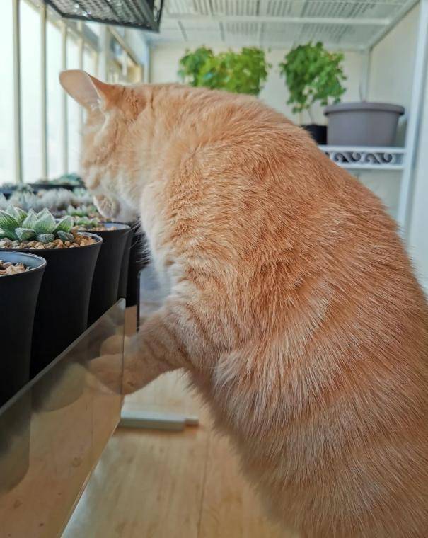 그 외에도 오렌지 고양이는 다육이를 철저히 점검하는 또 다른 중요한 작업도 합니다.