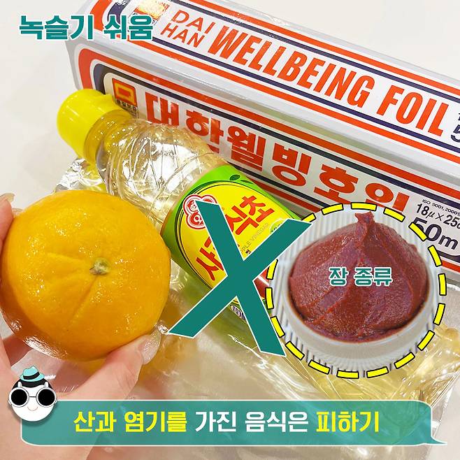따라서 산이 많고 염도가 높은 음식은 알루미늄을 녹여요. 식초나 레몬, 피클, 장아찌, 된장, 고추장 등은 알루미늄 호일과 냄비 사용을 피하고 플라스틱 용기를 사용해주세요!