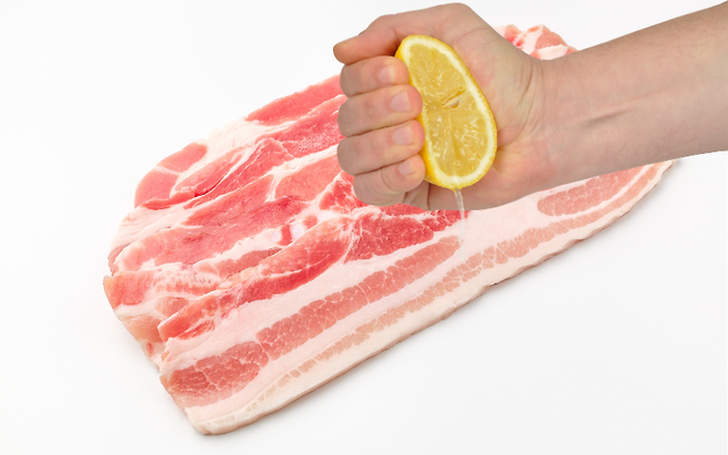 첫째, 고기를 굽기 전 레몬즙을 고루 뿌리고 10분 정도 재워두기.