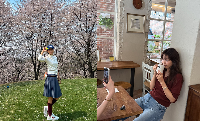 벚꽃이 만개한 화사한 배경 속에서 채정안이 세련된 골프 웨어를 선보이고 있다. 화이트 톱과 네이비 플리츠 스커트의 조합은 클래식한 골프 룩을 완성하며, 버건디 컬러의 양말과 화이트 스니커즈로 포인트를 주었다. 블루 캡과 크로스백으로 스포티한 느낌을 더했으며, 벚꽃과 어우러진 모습에서 봄의 생기를 담아내고 있다.