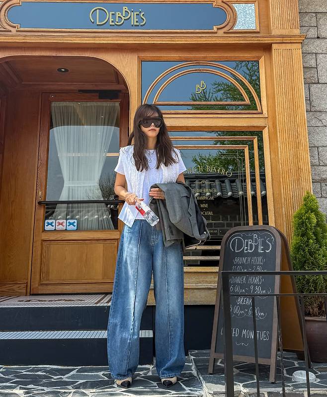 'DEBBIE'S' 레스토랑 앞에서 포착된 채정안의 와이드 데님 팬츠 룩이 시선을 사로잡는다. 화이트 프릴 디테일의 티셔츠와 여유로운 실루엣의 와이드 데님 팬츠 조합으로 편안하면서도 트렌디한 스타일을 완성했다. 오버사이즈 선글라스와 그레이 재킷을 손에 들고 있는 모습에서 도시적인 세련미가 느껴진다. 특히 와이드 데님과 슈즈의 조화가 스타일리시한 비율감을 연출하고 있다.