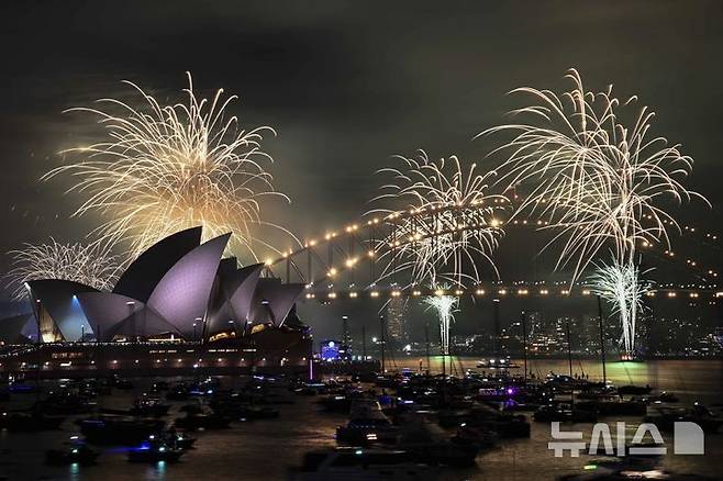 [시드니=AP/뉴시스] 31일(현지시각) 호주 시드니에서 새해 전야제 행사가 열려 오페라하우스와 하버 브리지 상공에 화려한 불꽃이 터지고 있다. 2024.12.31.