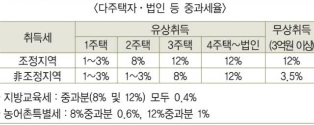 취득세도 양도소득세처럼 보유 주택 수에 따라 중과세 여부를 가릅니다. 이때 중요한 건 주택 수 산정입니다. 취득세의 주택 수를 판단할 때 개인이 아닌 세대원 기준이 됩니다. 주민등록등본에 등재돼 있는 모든 세대원의 주택 수를 모두 따진다는 것입니다. 또 세대원이 공동 소유한 주택은 2주택이 아니라 1주택으로 간주합니다. 부부가 한 채의 주택을 50대50의 비율로 취득하면 1주택으로 간주한다는 것이죠. 주택 수에 따라 취득 세율은 최고 11%포인트 차이가 나기 때문에 보유 주택 수의 산정 기준을 정확하게 알아두는 게 낭패를 피할 수 있습니다.