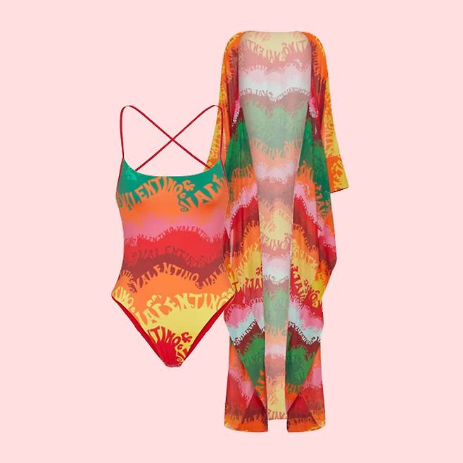 발렌티노 웨이브 멀티컬러 프린트 롱 보일 케이프 2백80만원, 프린트 디테일 라이크라 수영복 1백20만원